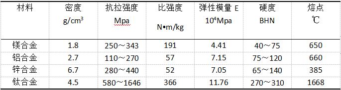 對于消費類產品而言,常用的合金材料有鋁合金、鋅合金和鎂合金。鈦合金由于其生物相融性好,常用在醫療領域。歸納性的總結先放在前面,見以下性能表。